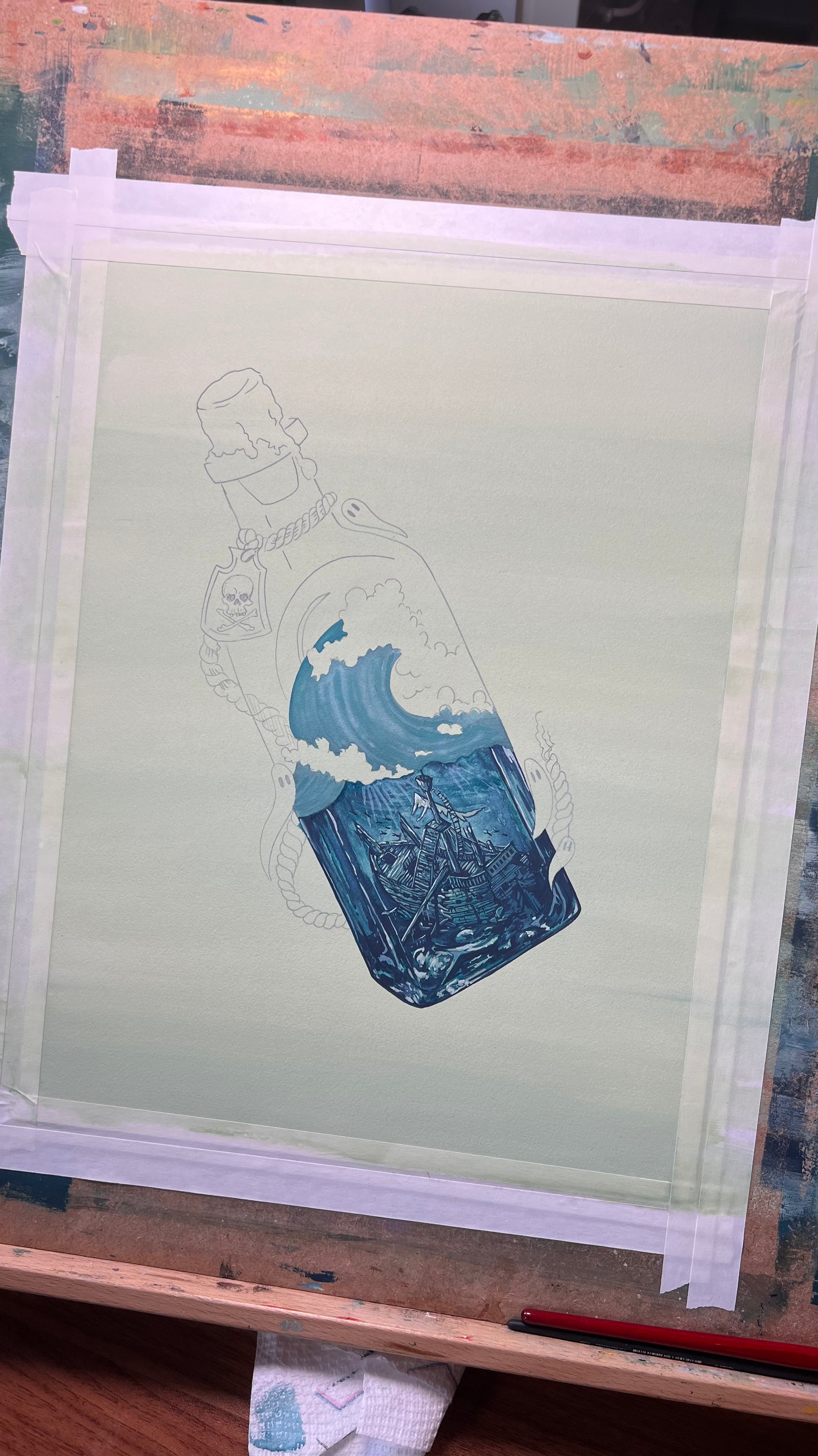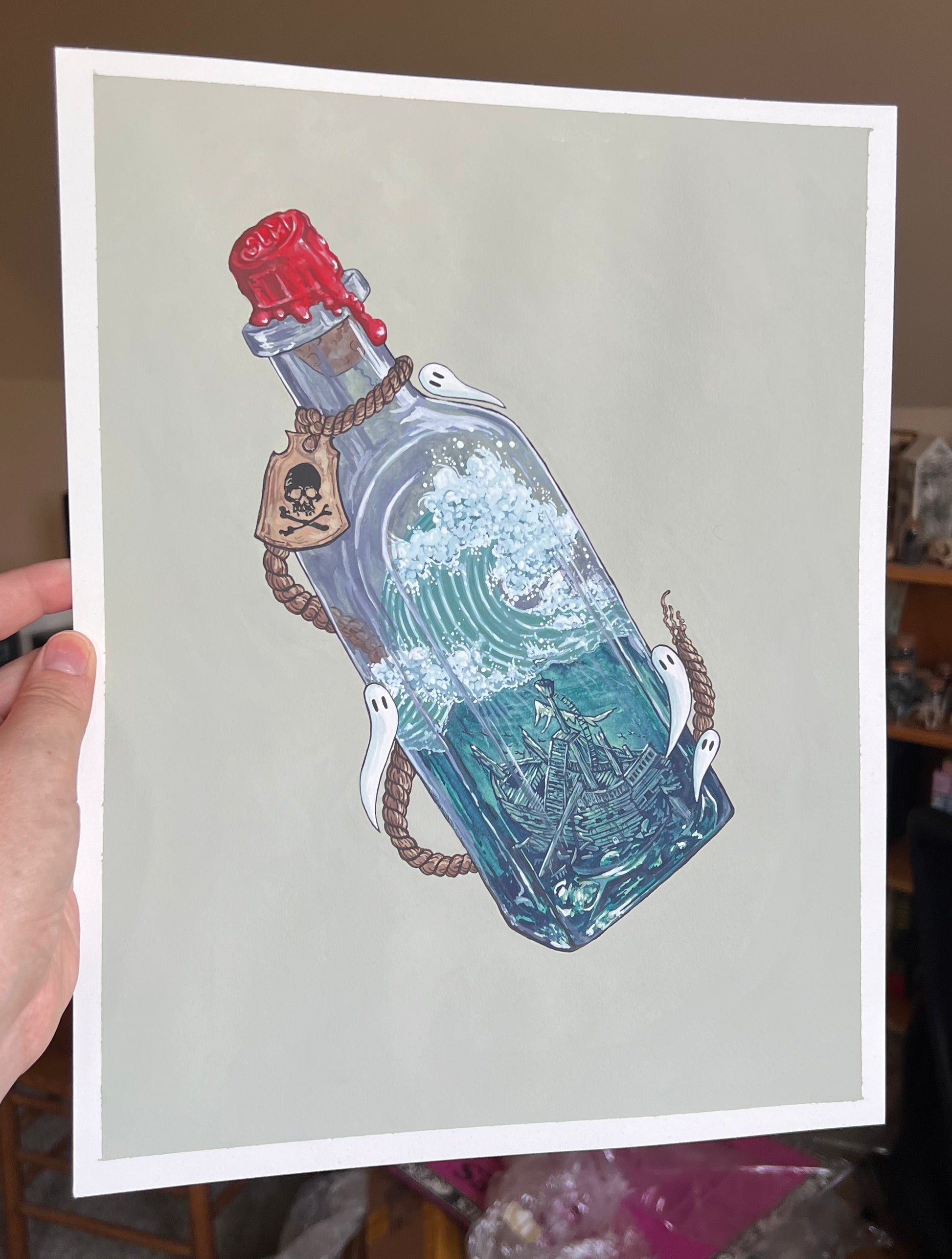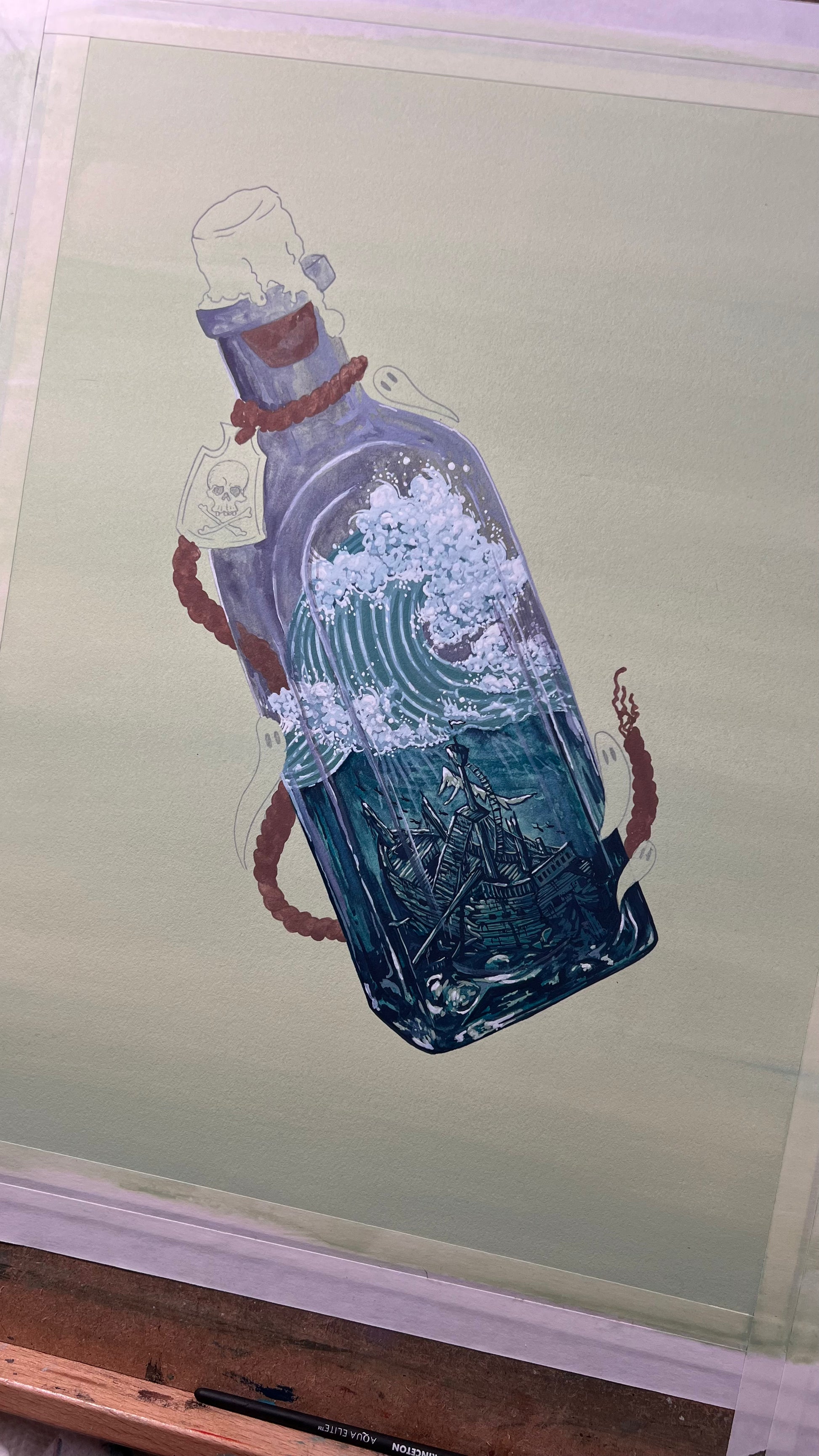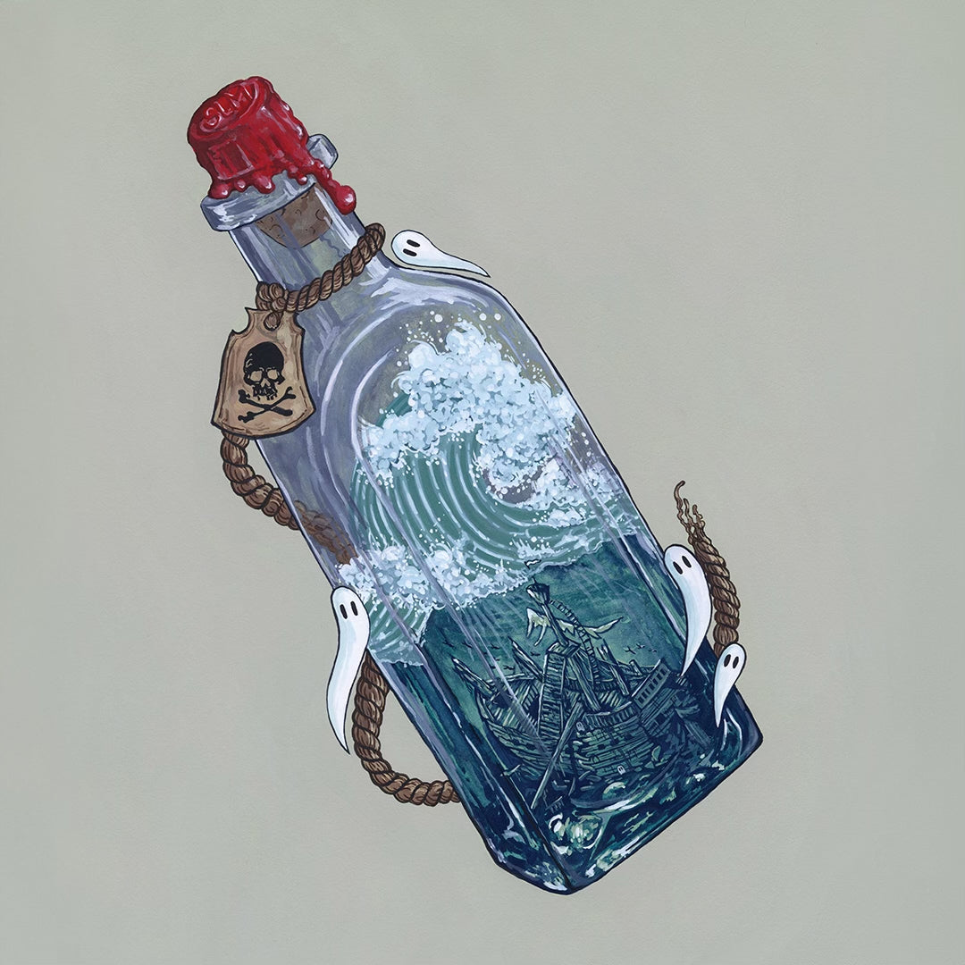 When I was a kid, I was enamored by people who tried to build a miniature ship inside a bottle. Maybe when I retire, I'll take it up as a hobby. But for now, I'm out here painting a Spooky Lake Month version: a shipwreck in a bottle. Ghosties and all.