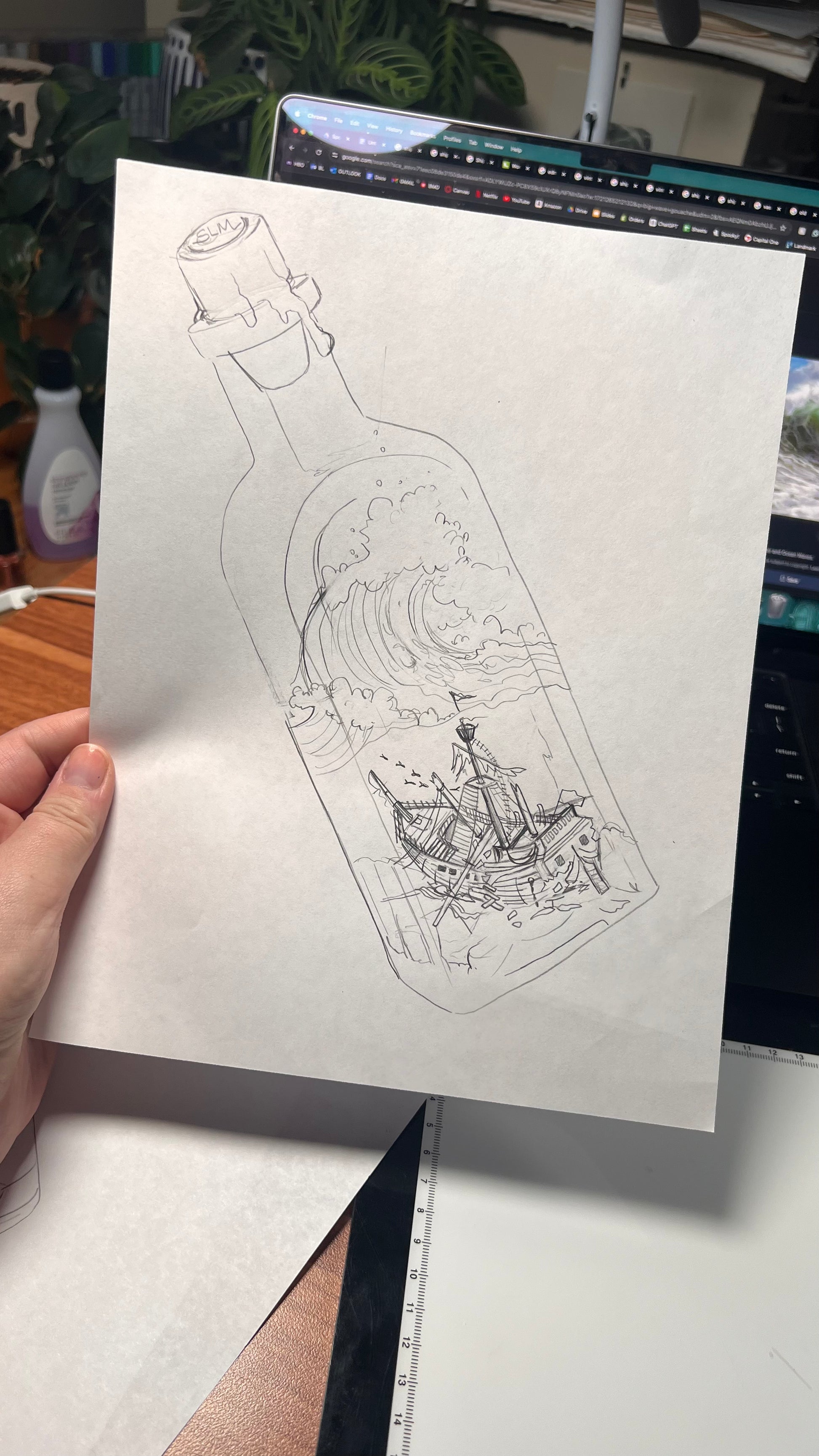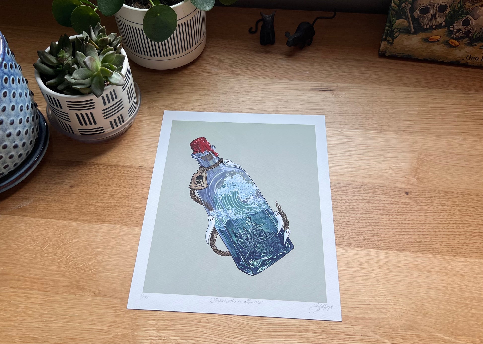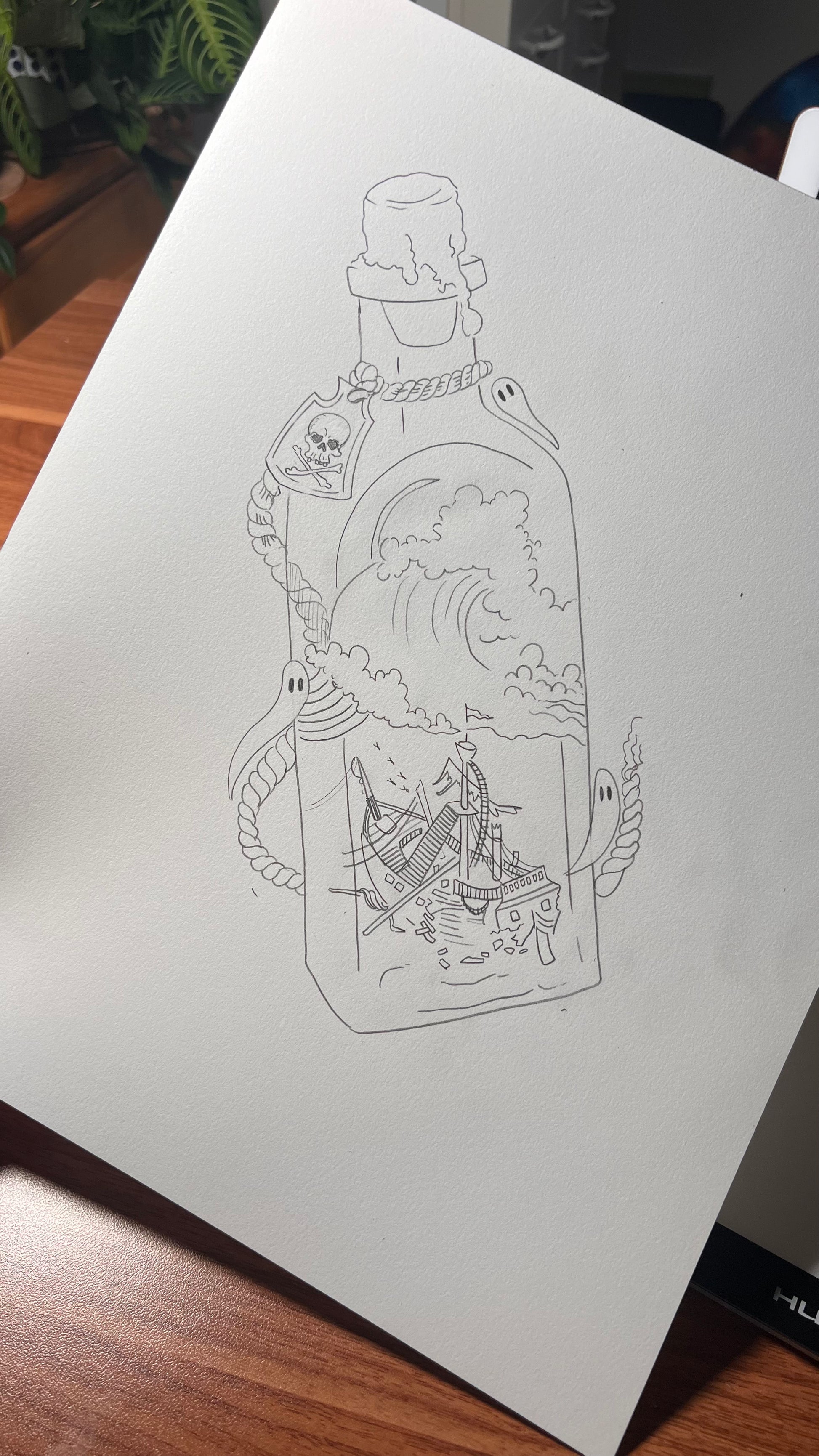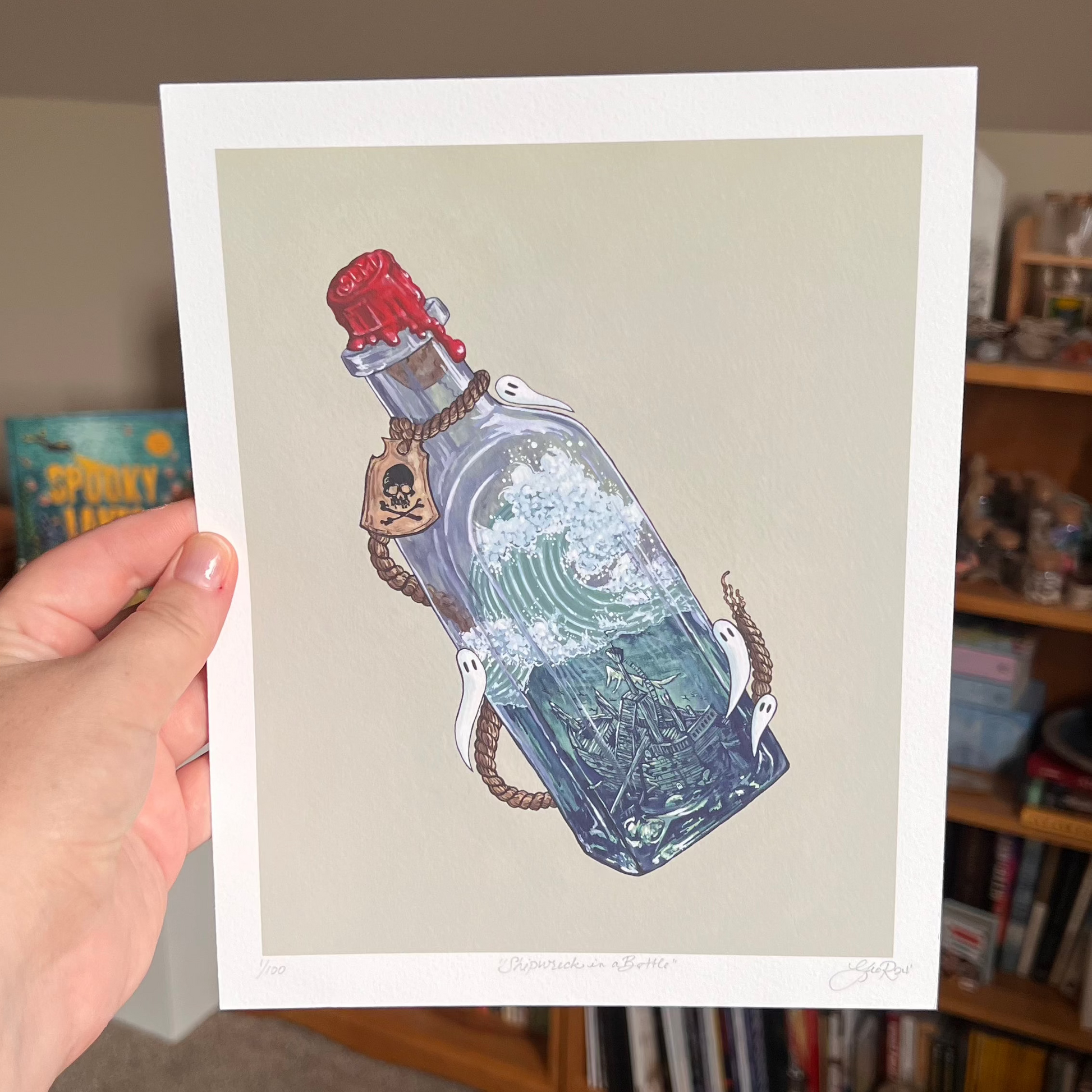 When I was a kid, I was enamored by people who tried to build a miniature ship inside a bottle. Maybe when I retire, I'll take it up as a hobby. But for now, I'm out here painting a Spooky Lake Month version: a shipwreck in a bottle. Ghosties and all.