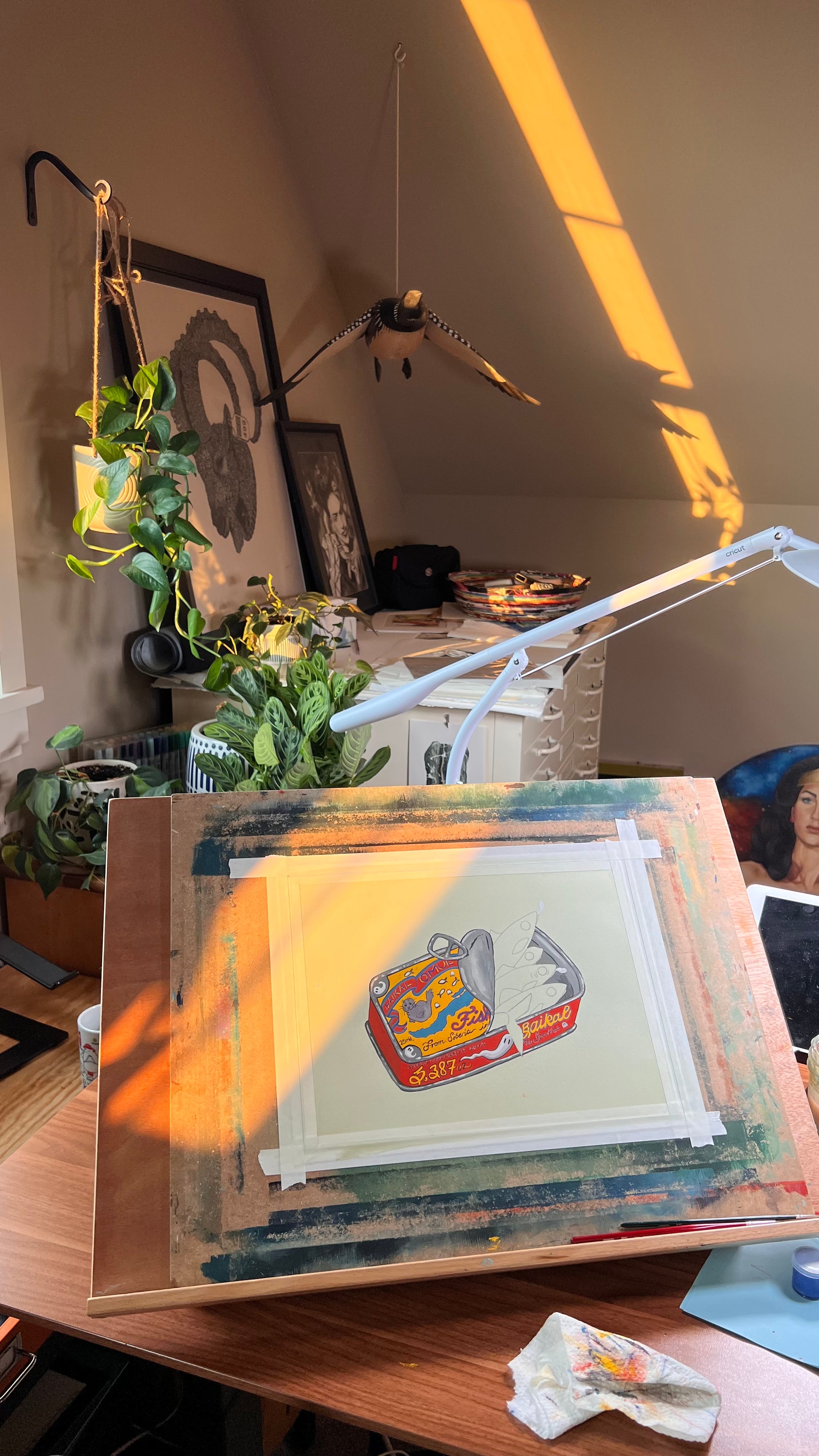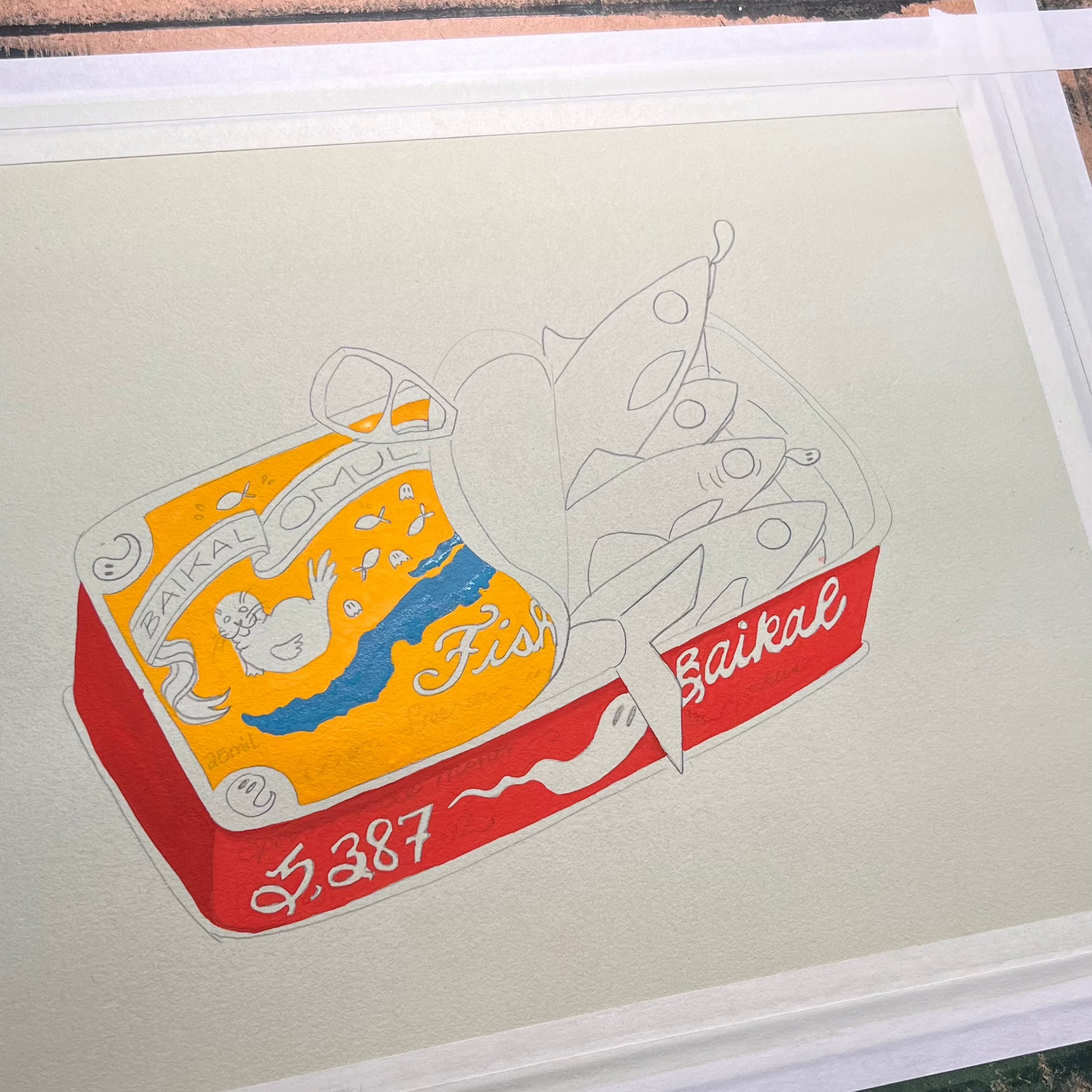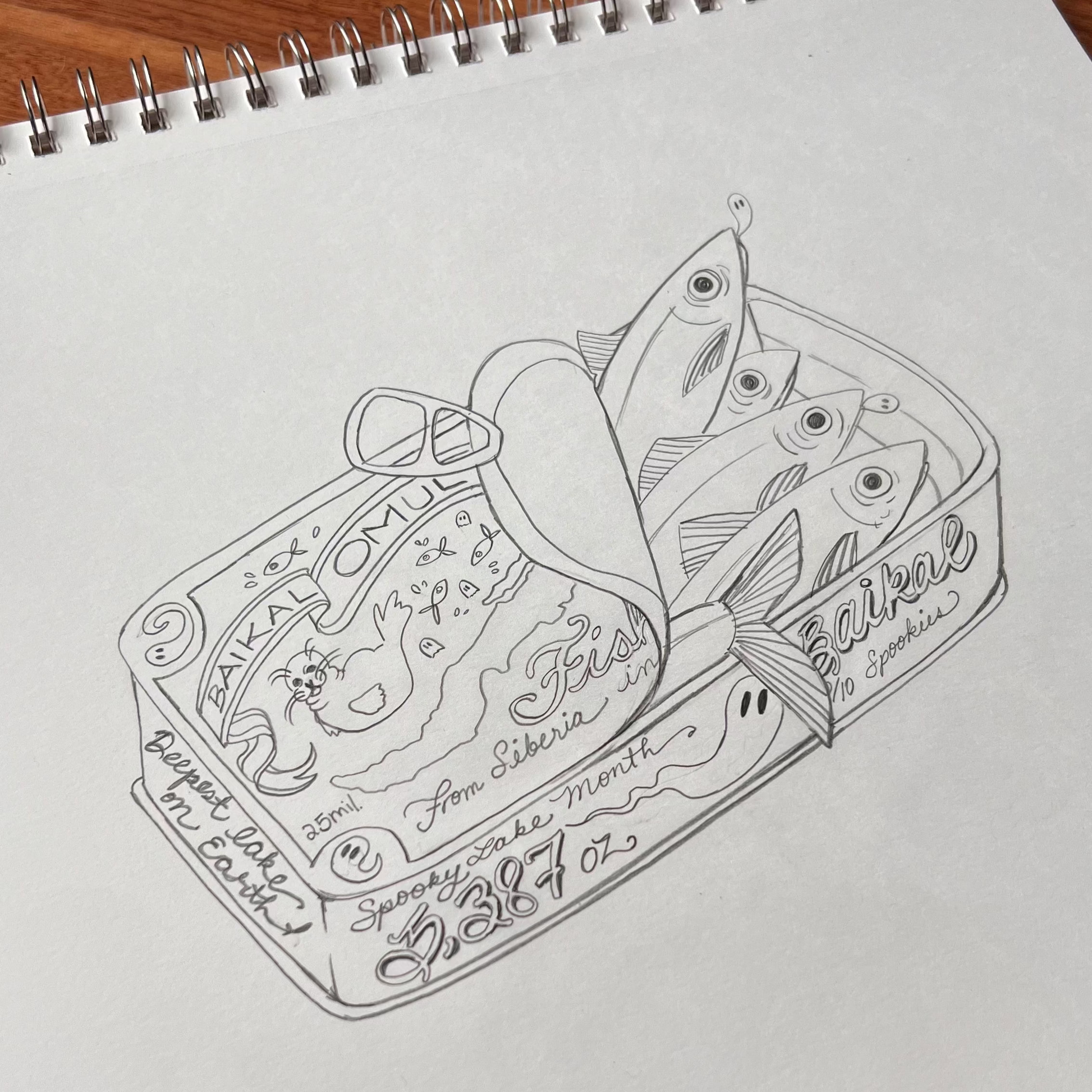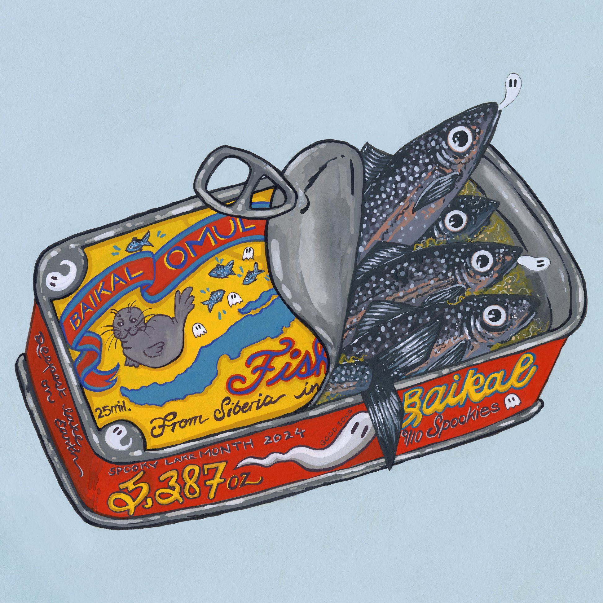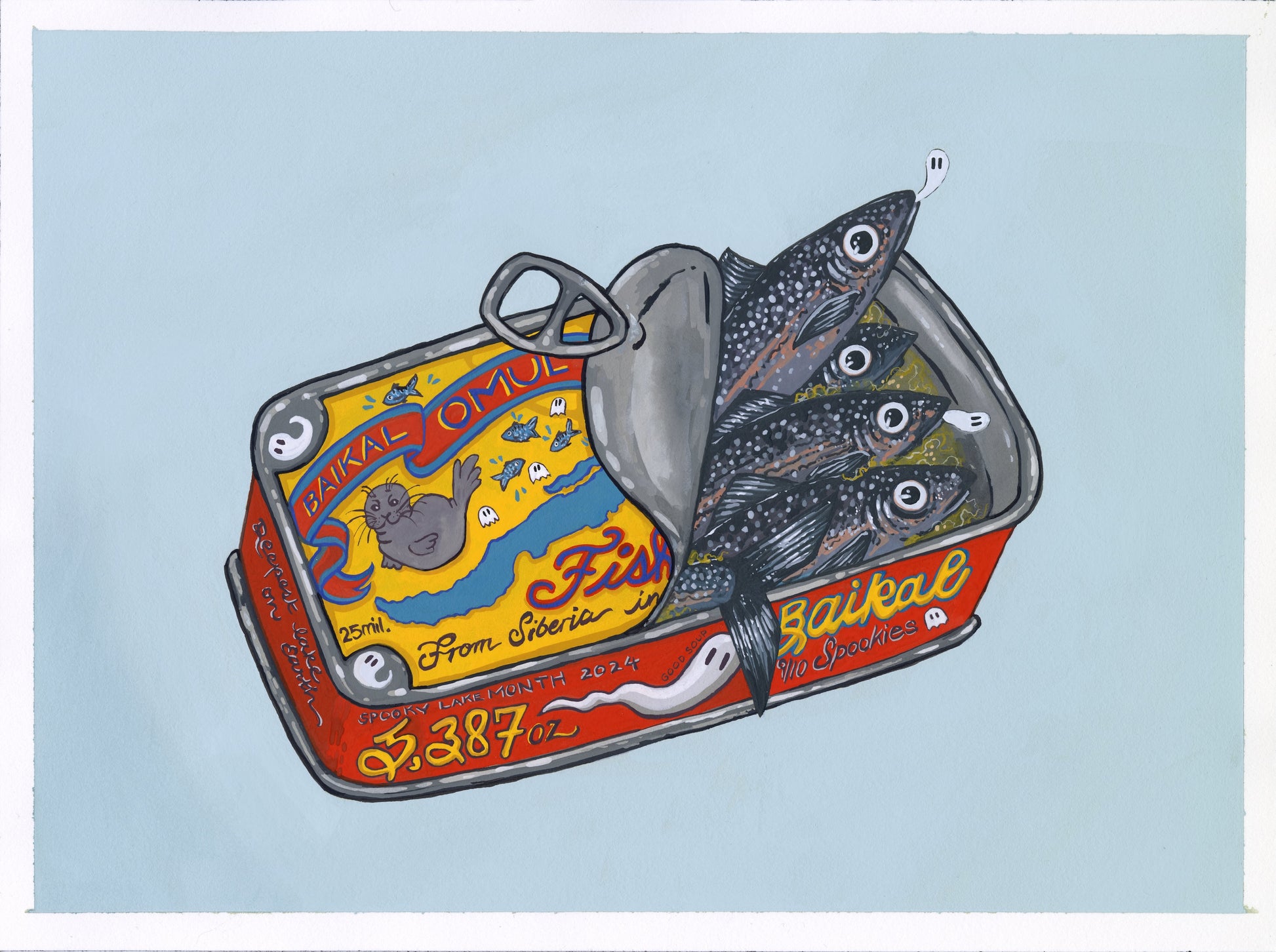 This painting idea made me cackle! Lake Baikal, my boo, is the deepest and oldest lake in the world! It's home to over 1,000 endemic species and the Omul fish is one such species! It's a prized delicacy to the local people and it's a critical part of the lake's unique ecosystem. Utilizing the adorable fish tin to showcase Lake Baikal only felt right! There are all sorts of hidden clues on the tin, from a reference to its age (25 million years old) to the depth (5,387 feet deep). Of course, on the top of the tin is a tiny image of the Nerpa Seal, Lake Baikal's most famous endemic species. And then some ghosties! For Spooky Lake Month, of course.