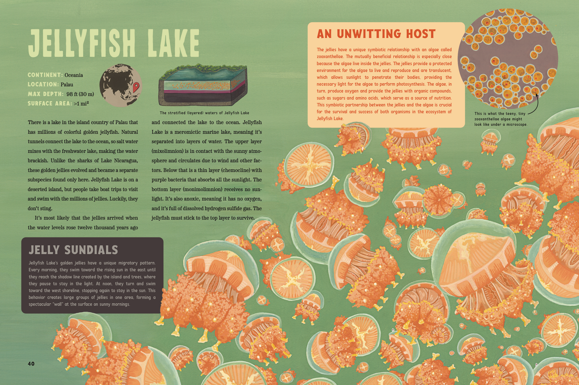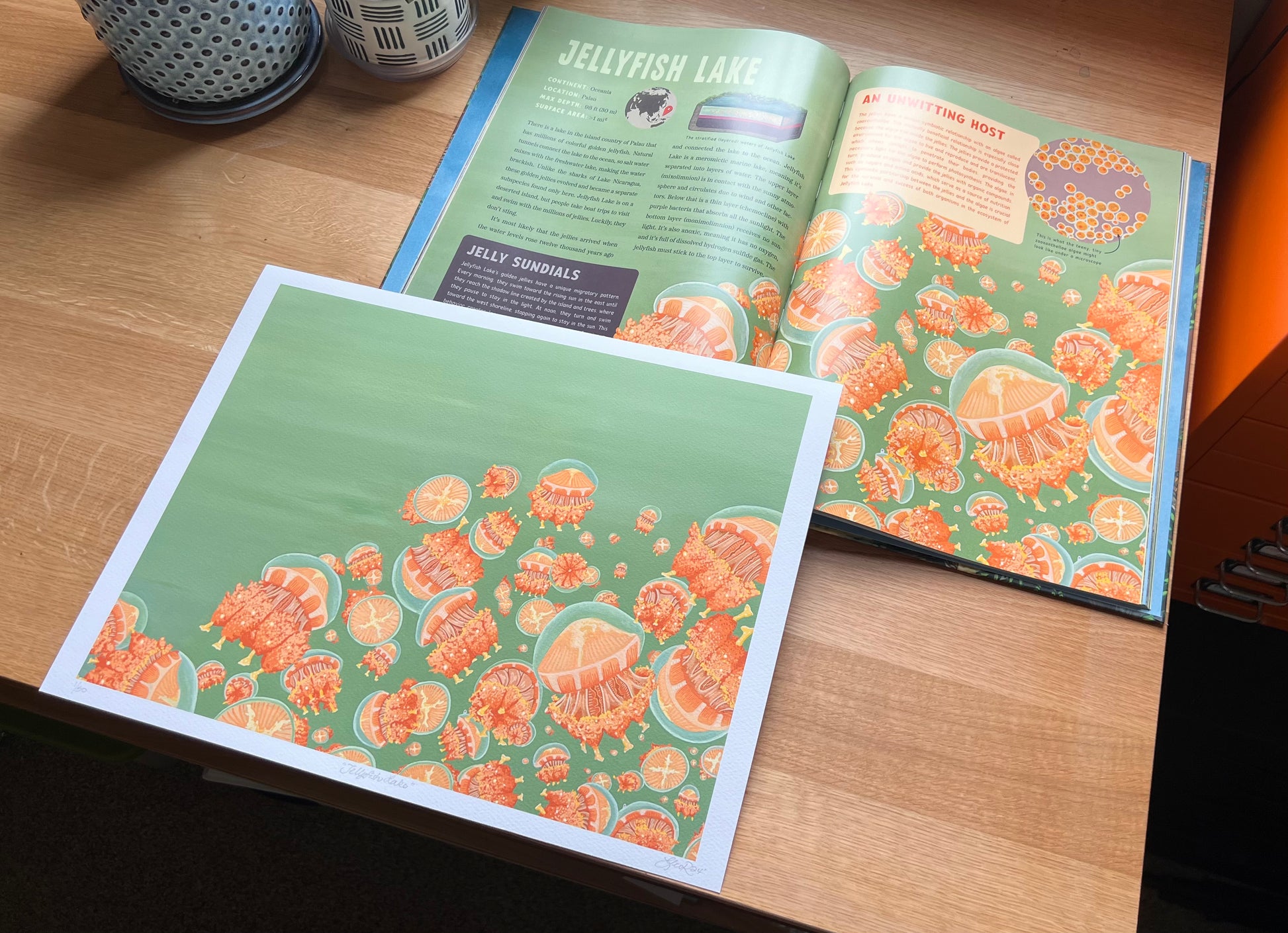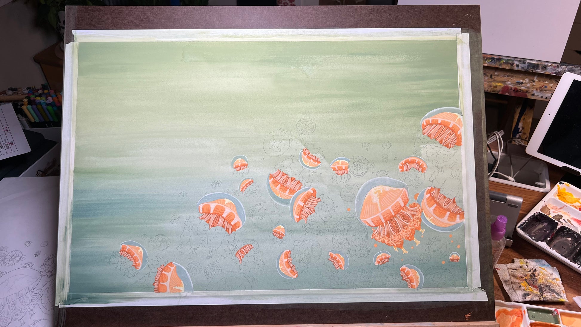 Jellyfish Lake in Palau is a special marine lake famous for having millions of golden jellyfish. Isolated from the ocean for millennia, the jellyfish migrate daily across the lake in search of sunlight. Can you spot the ghosties hidden in the painting?
