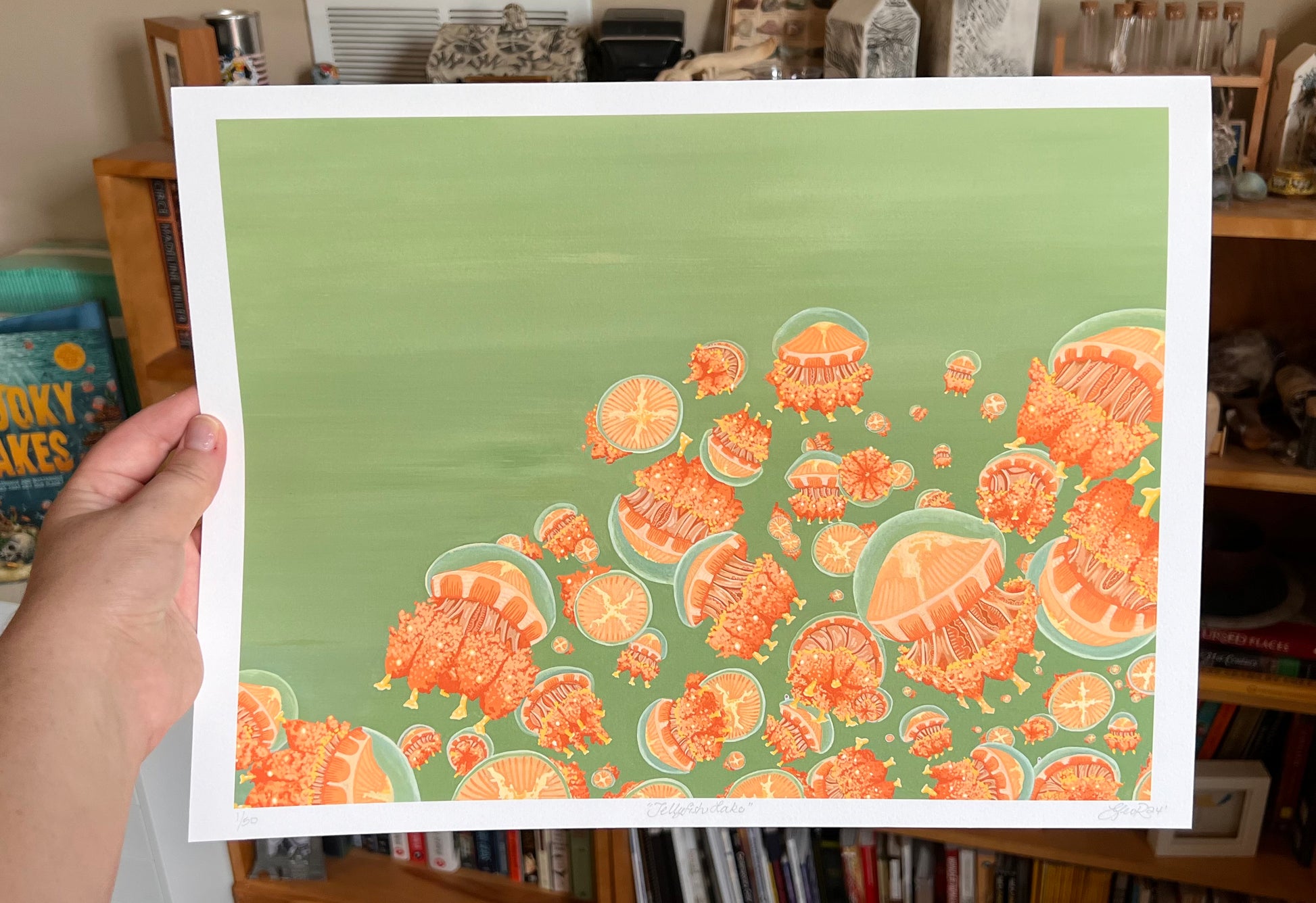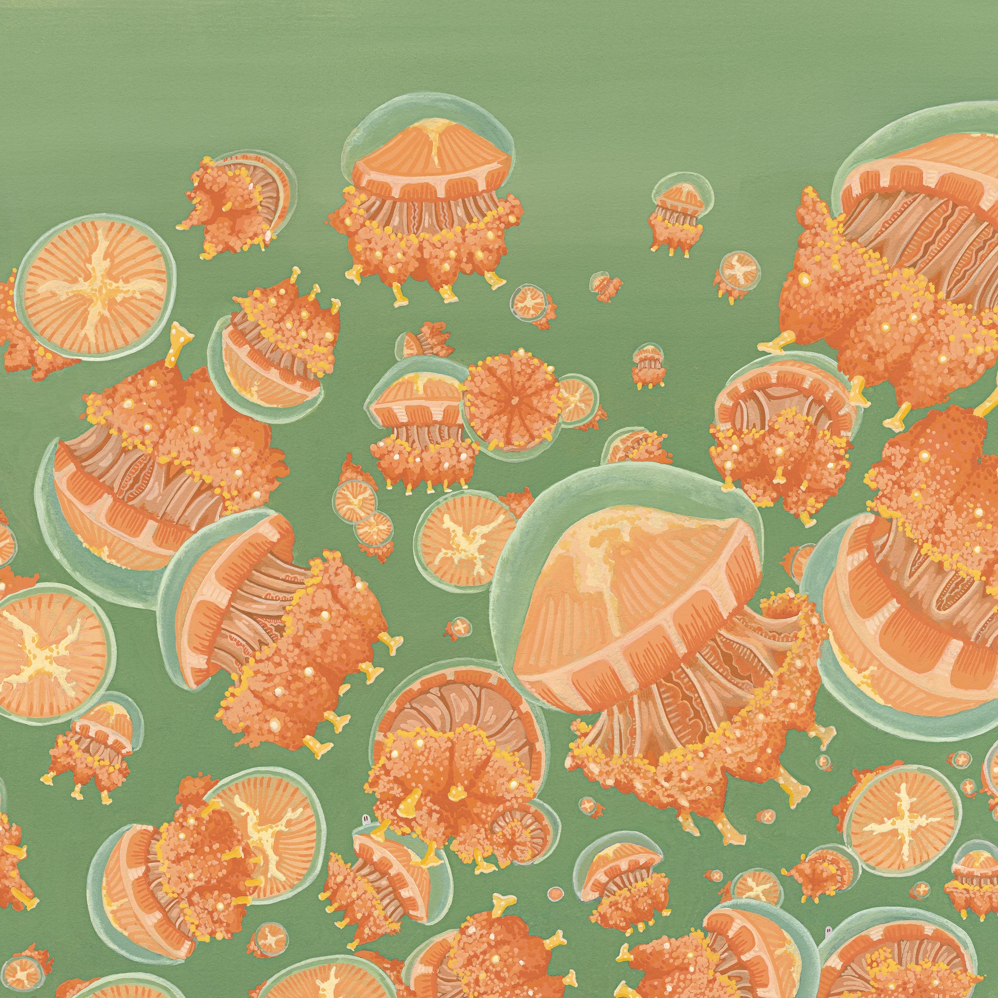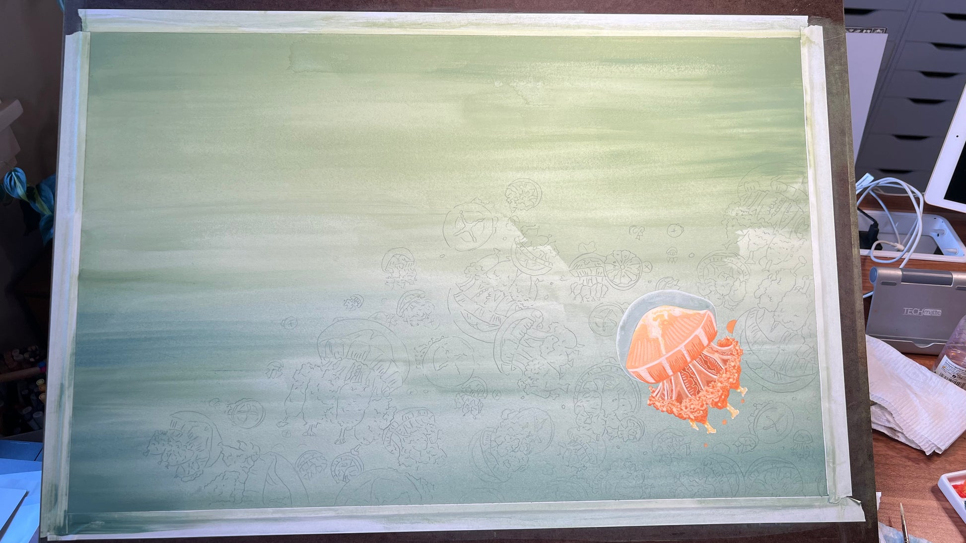 Jellyfish Lake in Palau is a special marine lake famous for having millions of golden jellyfish. Isolated from the ocean for millennia, the jellyfish migrate daily across the lake in search of sunlight. Can you spot the ghosties hidden in the painting?