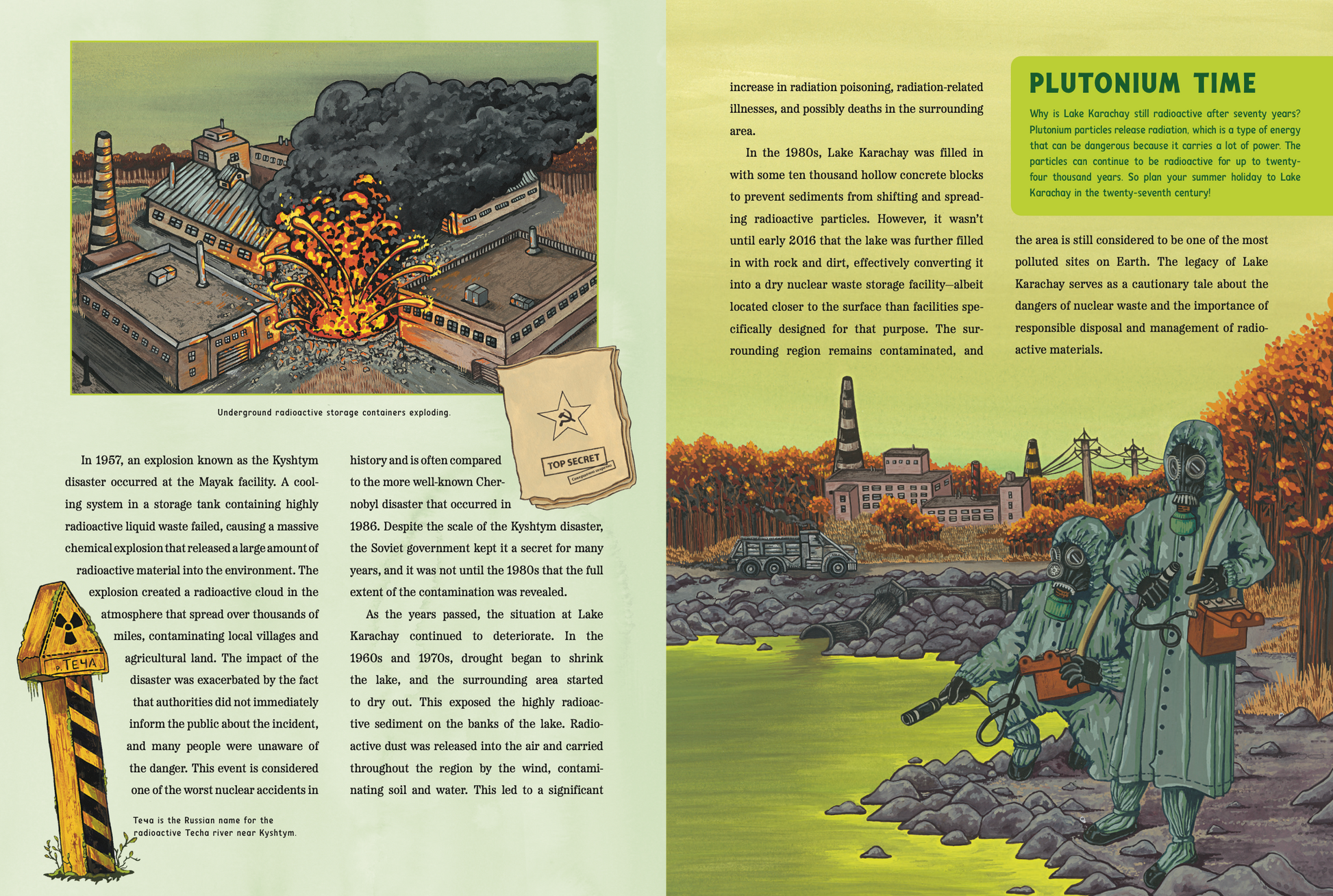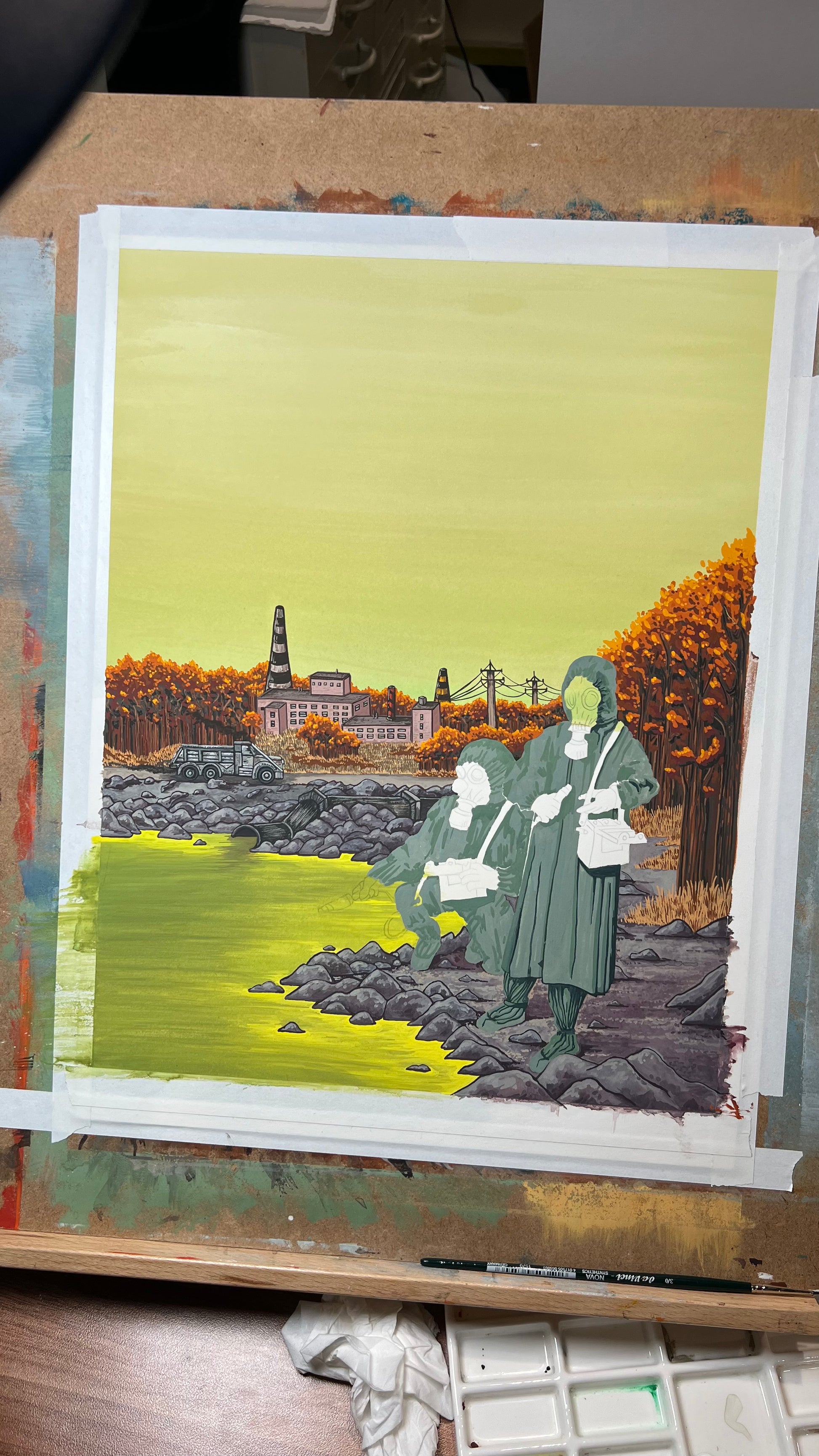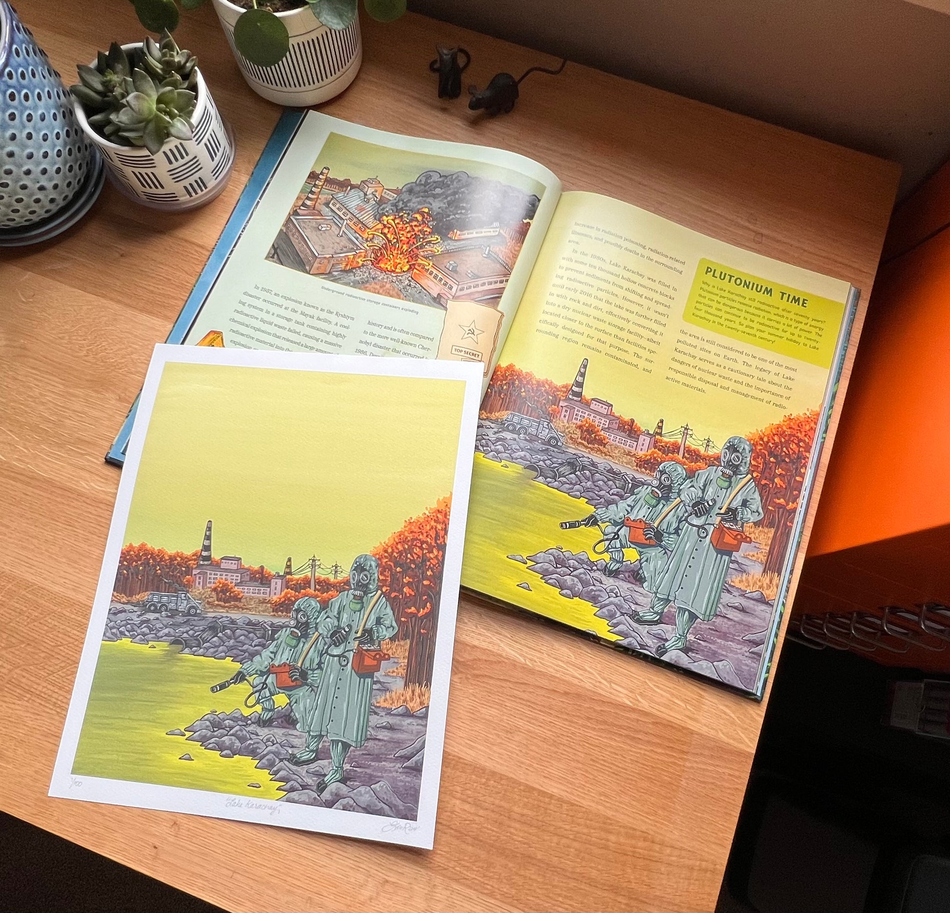 Don't tell anyone... but this is my favorite painting from the book! I was so nervous about how to paint these figures decked out in classic USSR radiation protective gear on the shores of Lake Karachay (the most radioactive lake in the world!) but it turned out to be my favorite. I'm not sure how many people want to hang this in their house but I would! Perfect for above a toilet ☢️