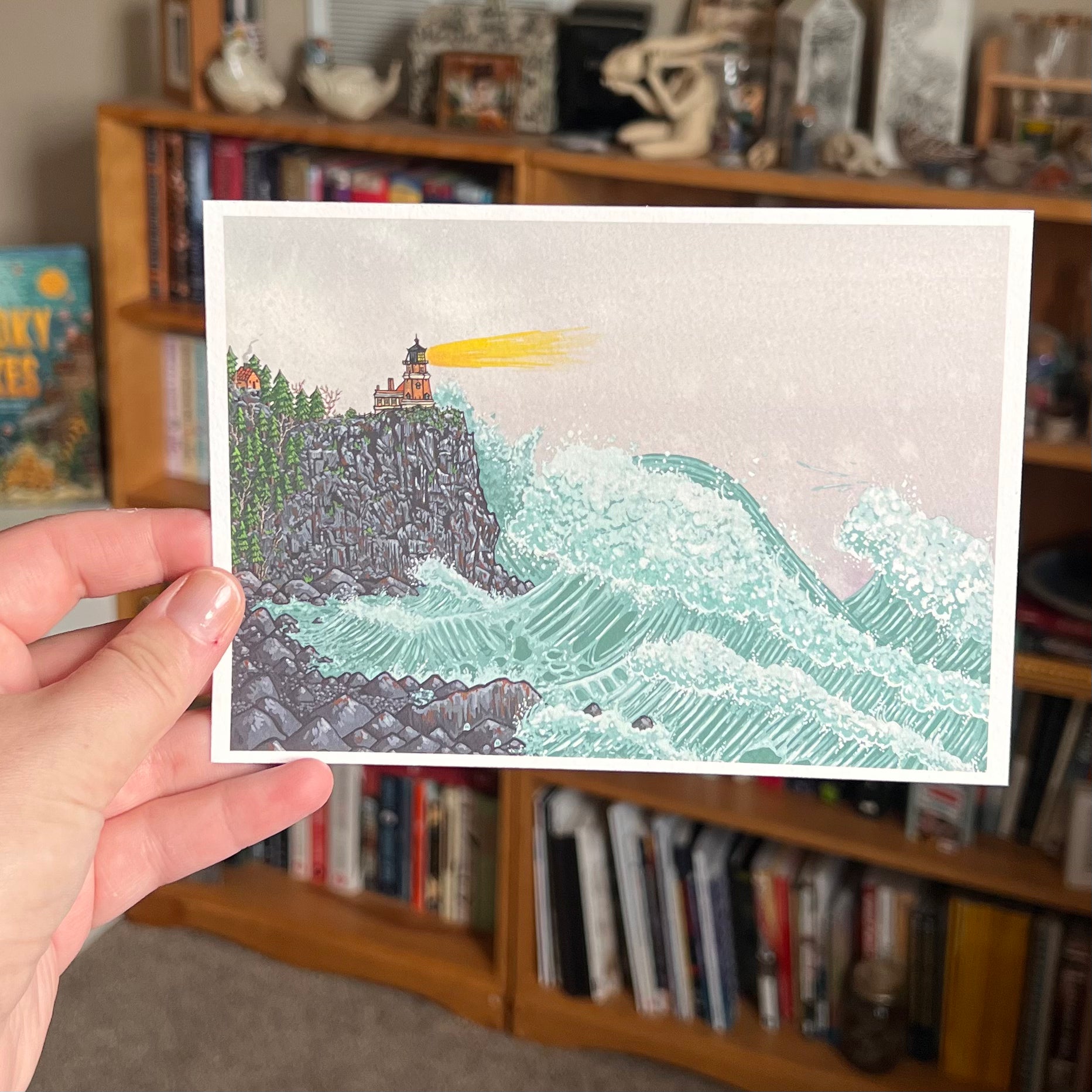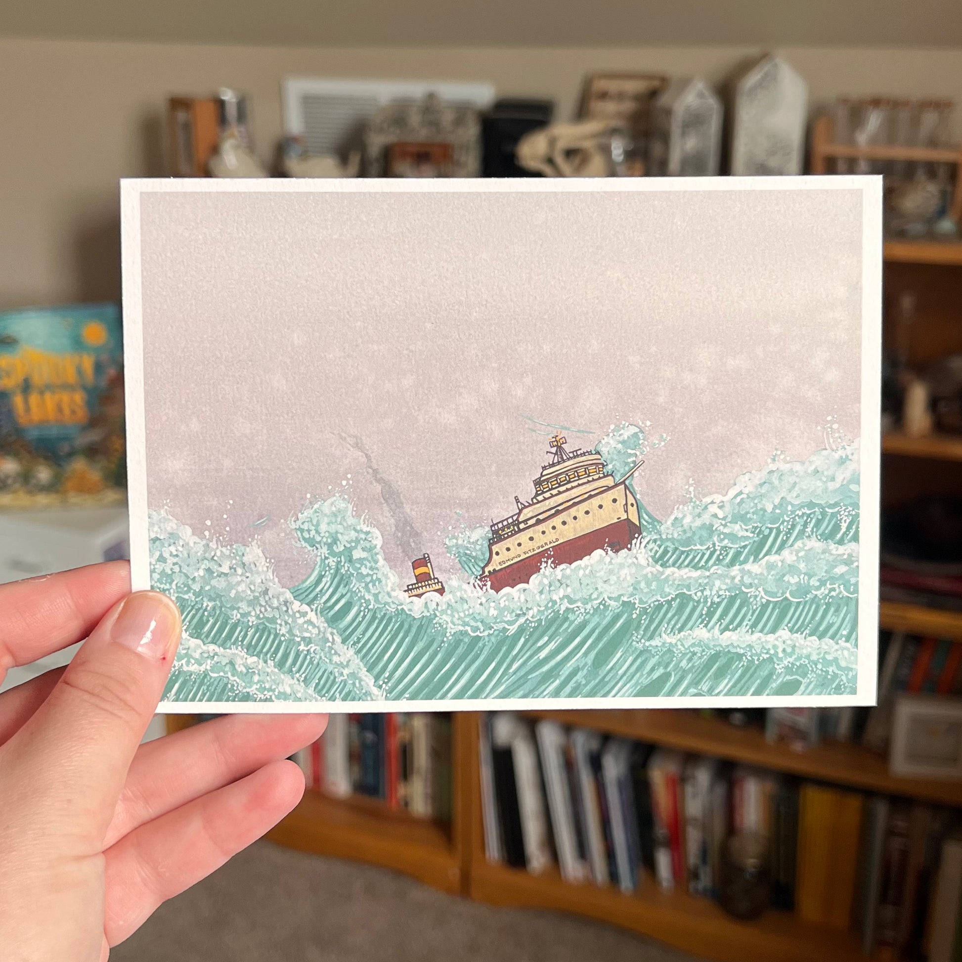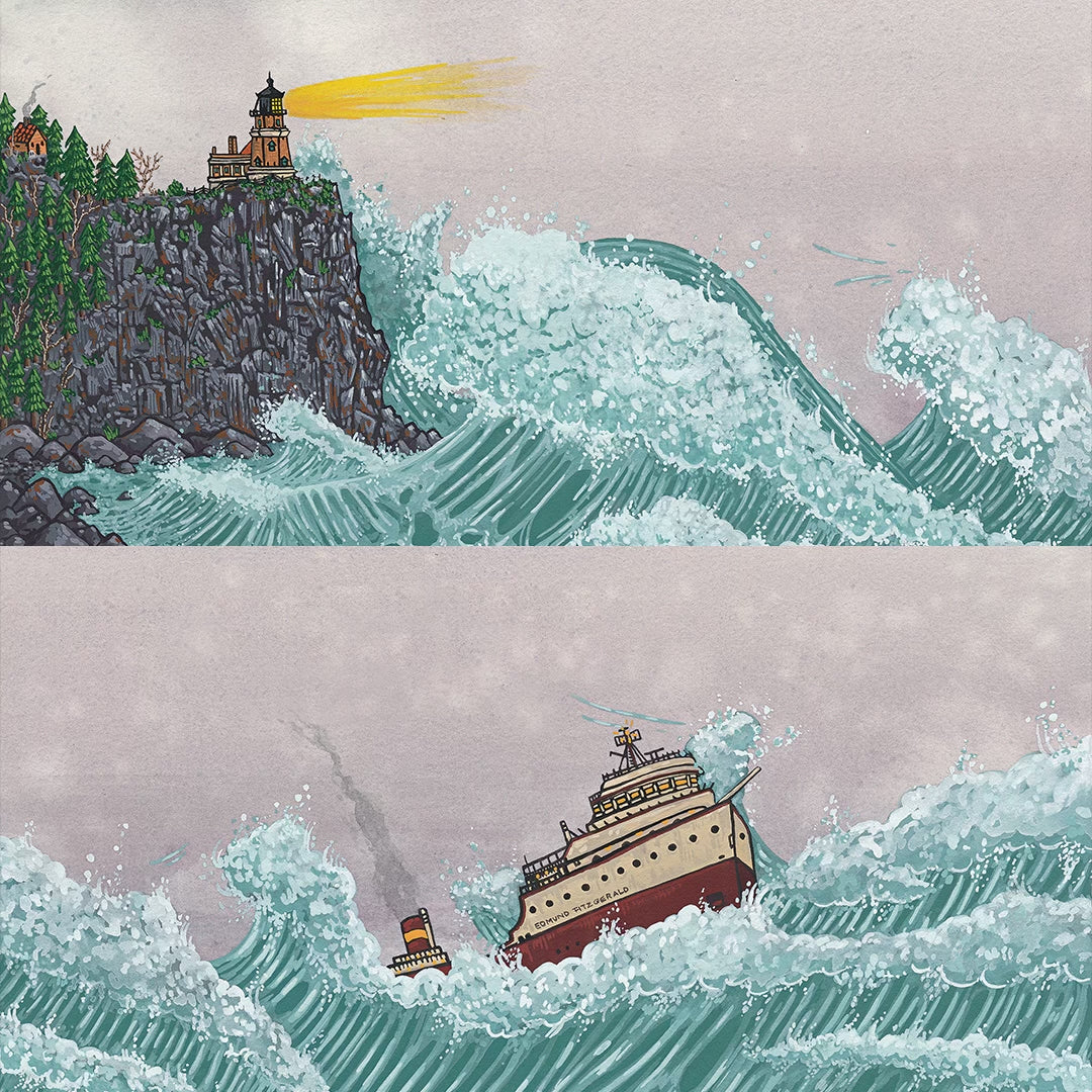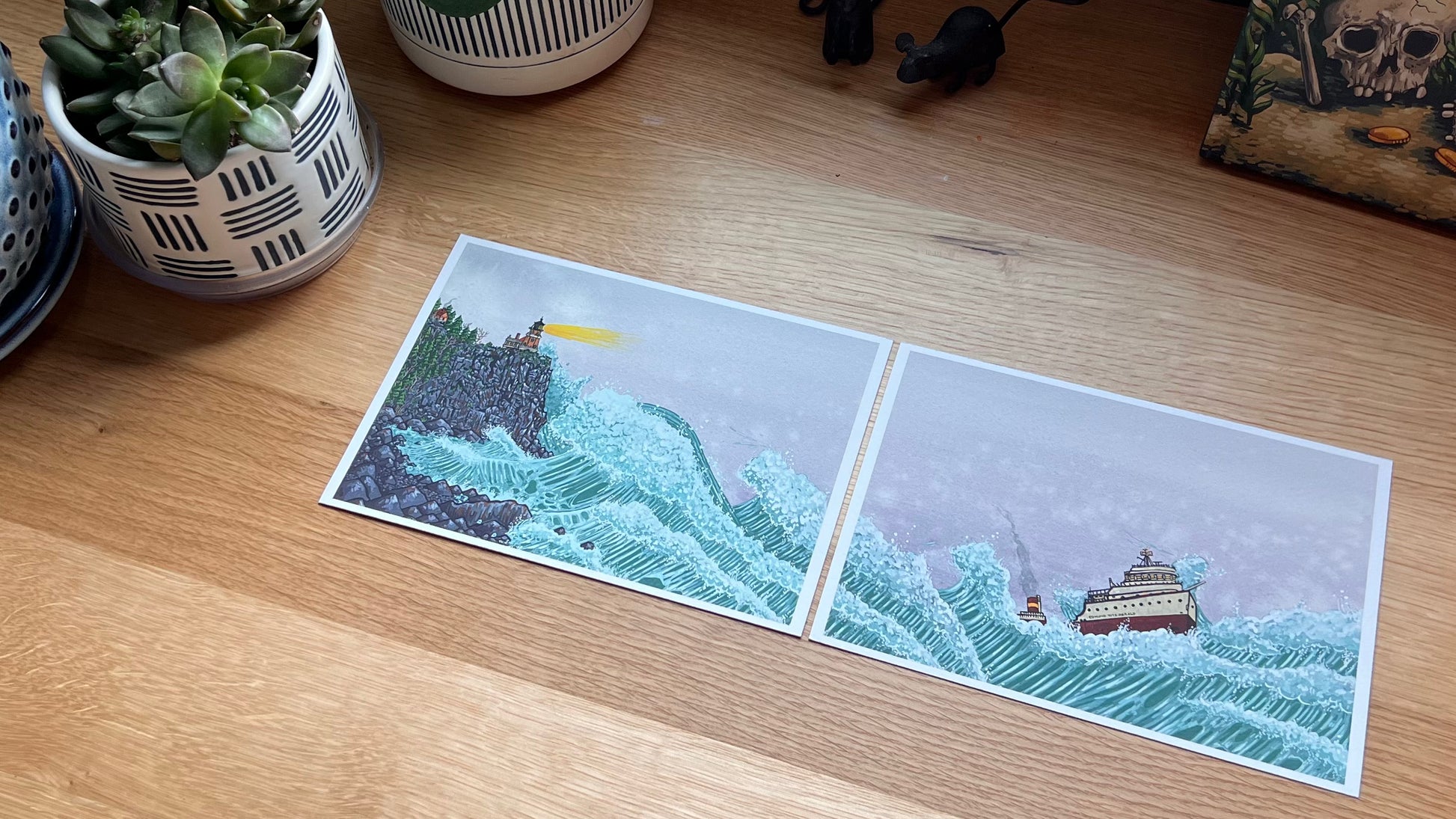 Two iconic Lake Superior images in one painting, split into two small prints. The Split Rock Lighthouse and the SS Edmund Fitzgerald. The ship didn't wreck near this lighthouse, but I wanted an opportunity to paint both, so I imagine this is another wild storm that the industrial freighter weathered.