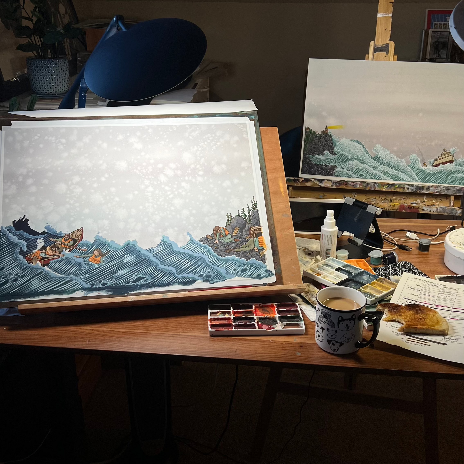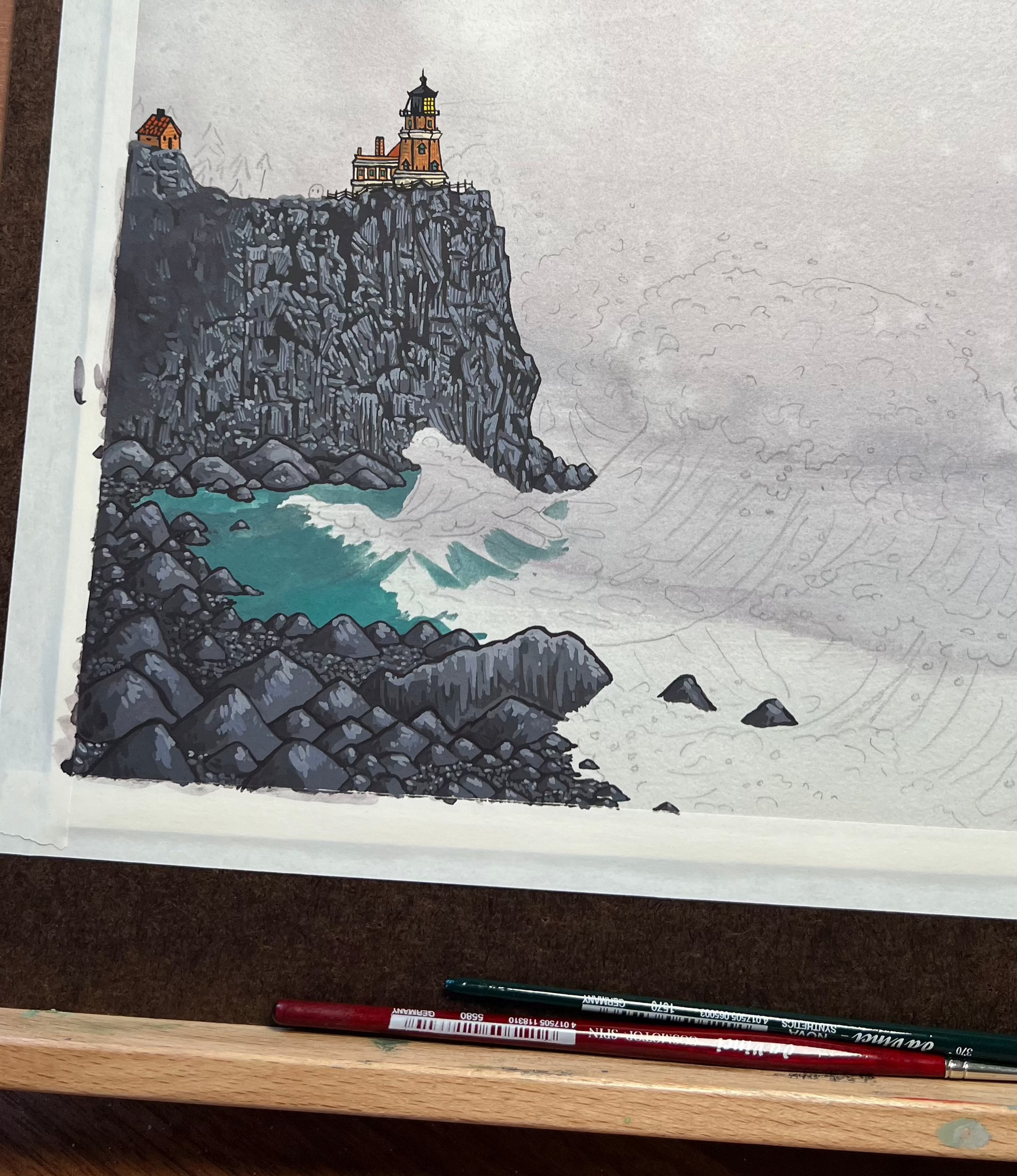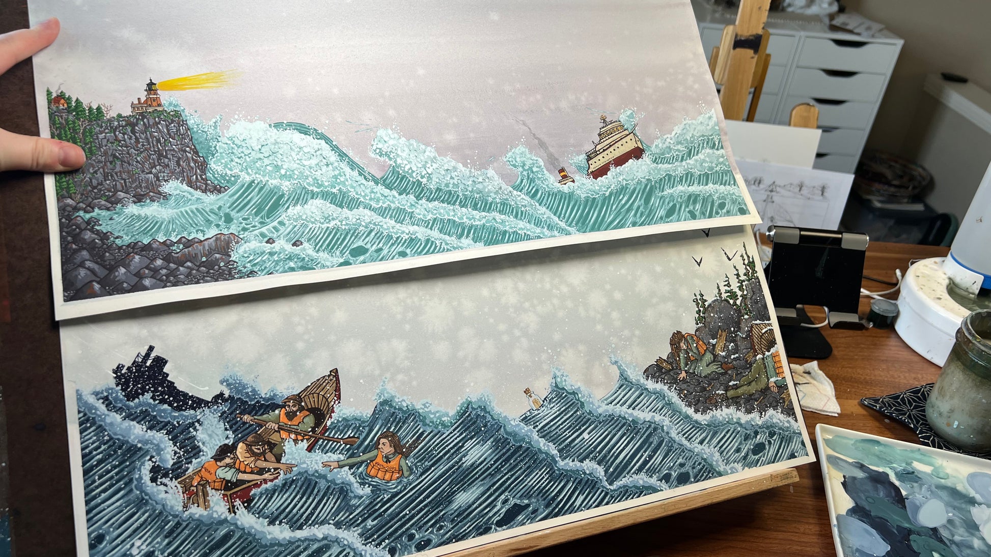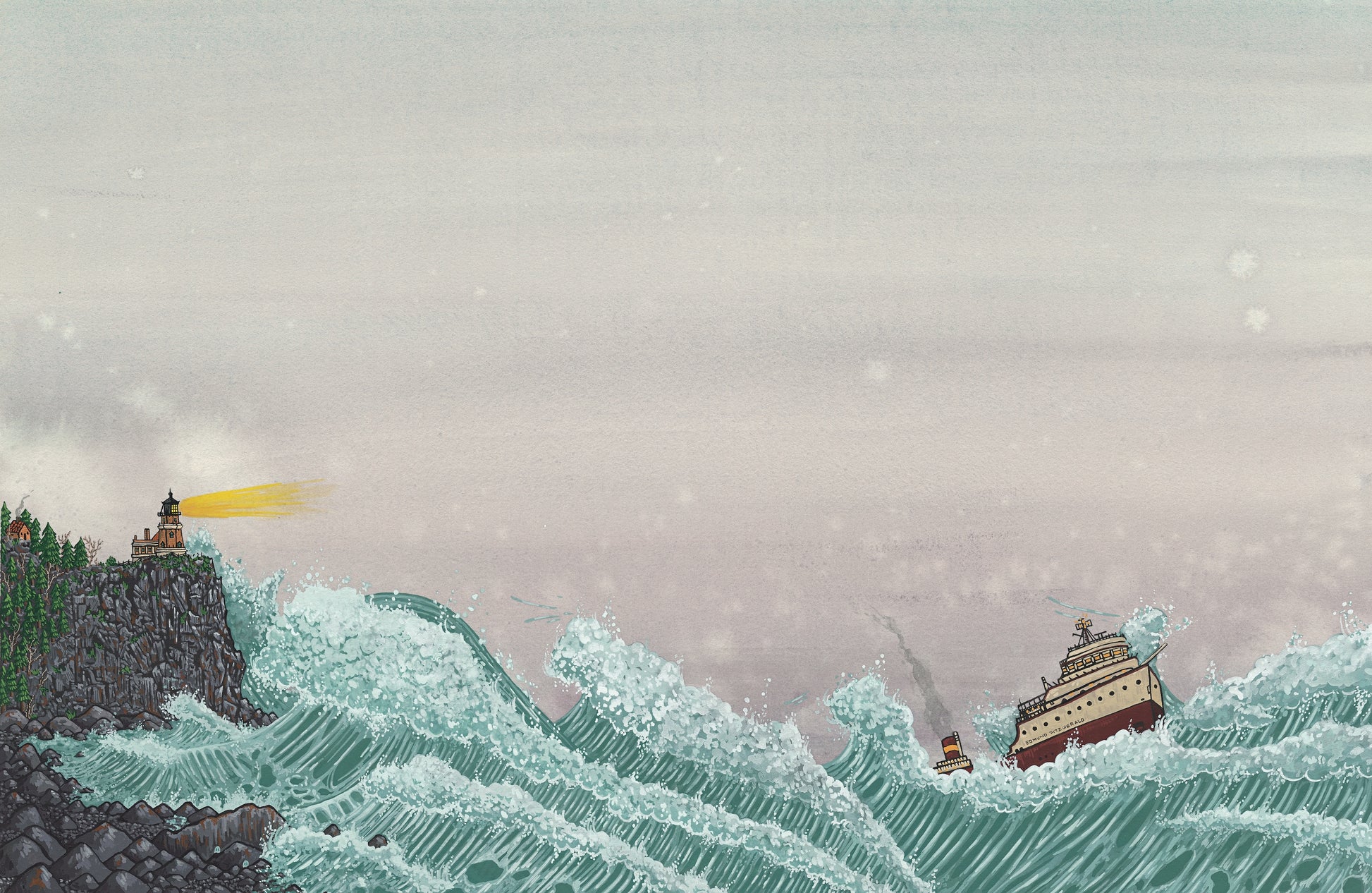 Two iconic Lake Superior images in one painting, split into two small prints. The Split Rock Lighthouse and the SS Edmund Fitzgerald. The ship didn't wreck near this lighthouse, but I wanted an opportunity to paint both, so I imagine this is another wild storm that the industrial freighter weathered.